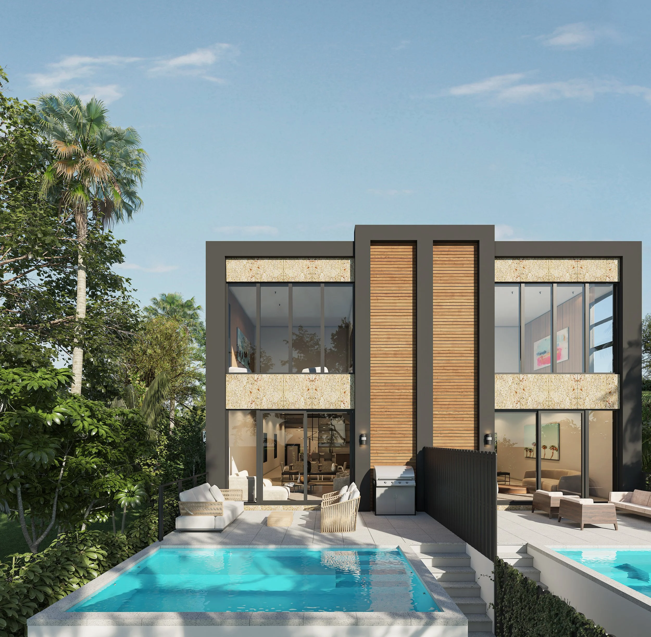 Each residence is organized around an open, light-filled floor plan designed to support contemporary indoor-outdoor living. The ground floor includes kitchen, dining, and living spaces that extend directly to an uncovered terrace and private pool, creating a seamless relationship between interior and exterior space. Large impact-rated windows and sliding glass doors maximize natural light, while the overall layout emphasizes clarity, openness, and connection to the surrounding tropical landscape. Each unit includes four bedrooms and four-and-a-half bathrooms, with the private bedroom level arranged above for comfort, retreat, and separation from the main social spaces below.