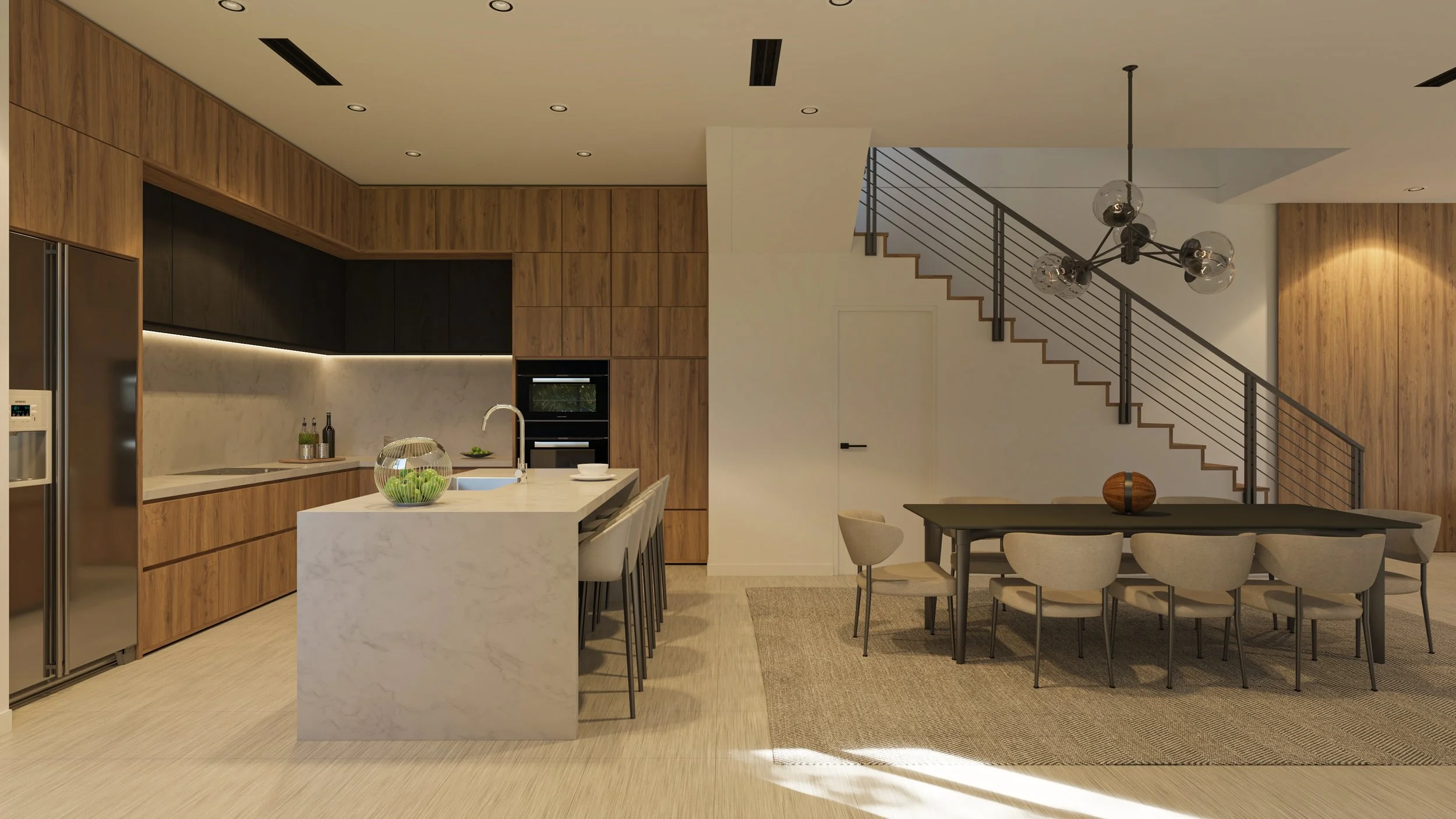 Inside, the homes are defined by warm natural finishes and a carefully coordinated contemporary interior language. European-style millwork, natural wood-look cabinetry, solid oak stair treads, large-format porcelain flooring, quartz countertops, integrated lighting, and built-in storage contribute to an atmosphere that is both elegant and highly livable. Kitchens are conceived as central gathering spaces with generous islands and premium appliance packages, while bathrooms feature full-height tile, illuminated mirrors, glass enclosures, and a calm, spa-like material palette. Smart home systems and durable high-quality construction elements further support the project’s focus on functionality, comfort, and long-term value.