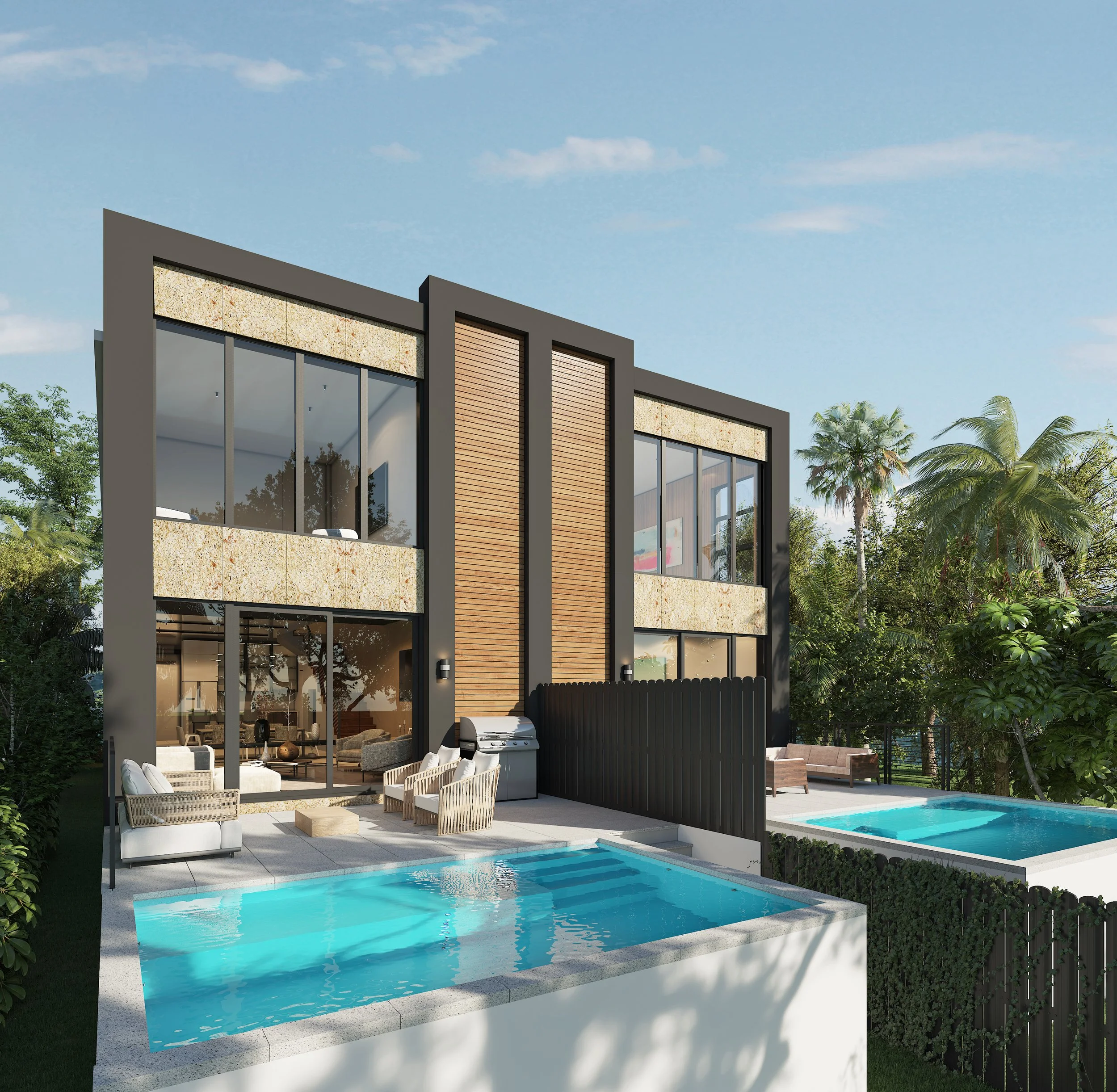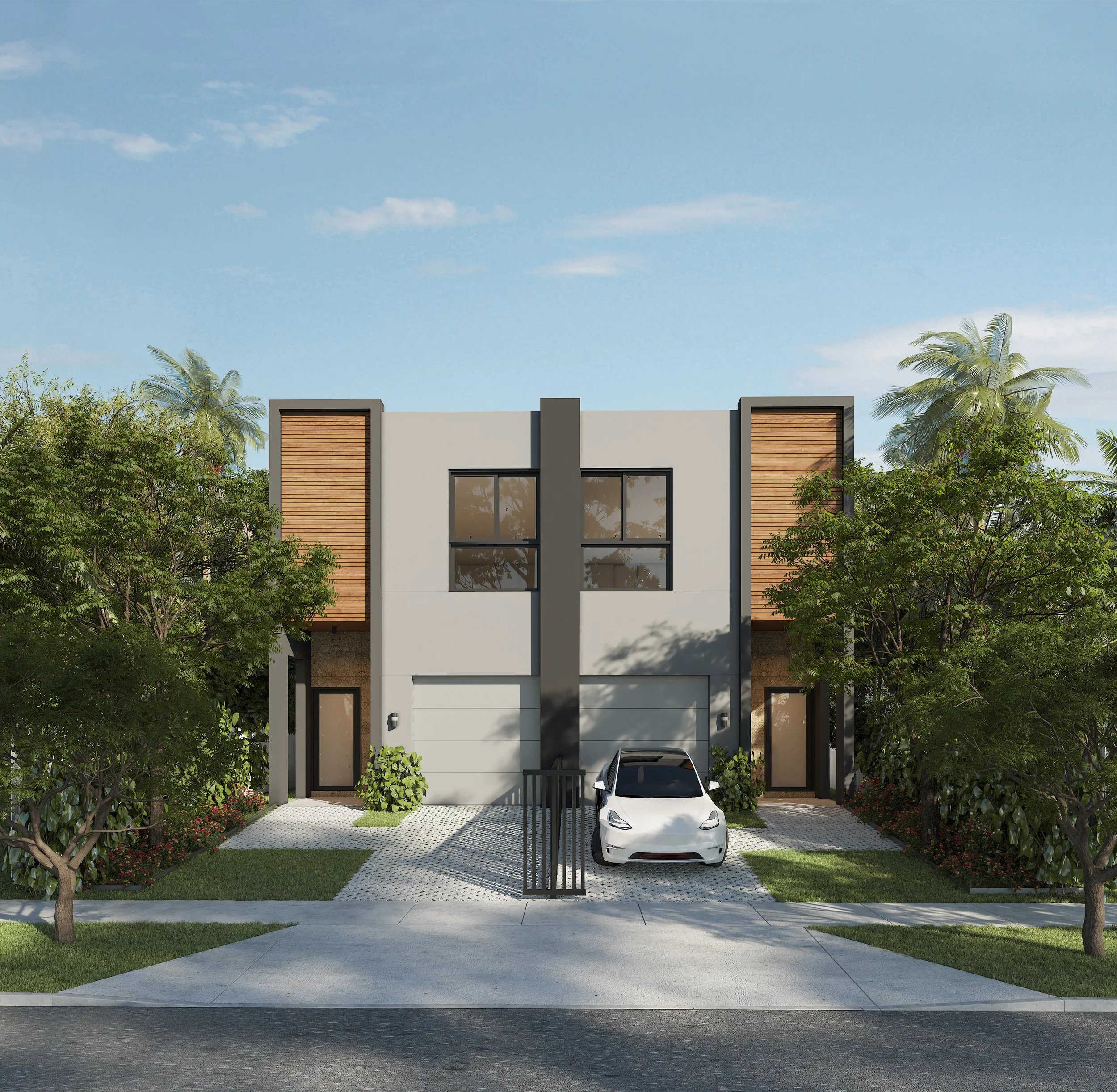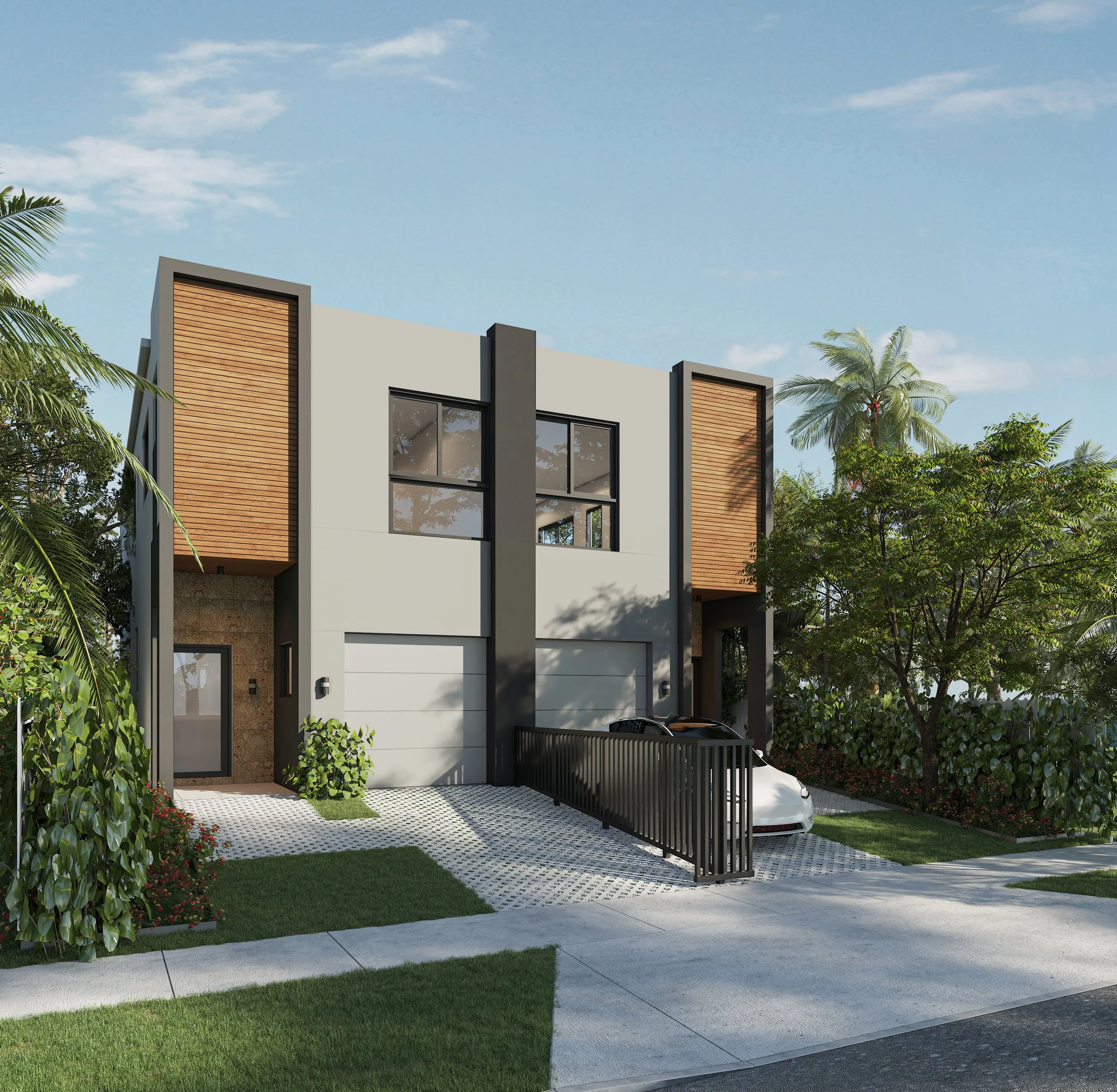 Townhomes on 33 Avenue is a pair of contemporary residences that brings a clean, modern approach to urban living in Miami. Defined by strong geometric volumes, expansive glazing, and a restrained material palette, the project balances simplicity with warmth. The exterior composition combines smooth stucco planes, dark framed volumes, wood accent panels, and stone surfaces to create a façade that feels both refined and grounded. Private entries, gated front courts, and integrated landscaping reinforce a sense of privacy while maintaining an open and welcoming residential character.