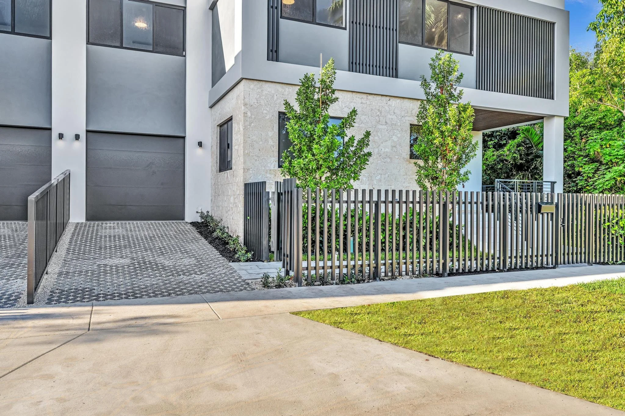 These modern twin townhomes in North Coconut Grove reinterpret urban living with a focus on openness, natural light, and functional design. The two-story residences are expressed as a series of bold geometric forms softened by warm material contrasts. Crisp stucco volumes are paired with stone cladding and vertical accents, while expansive glazing creates a strong visual connection between interior spaces and the surrounding landscape.