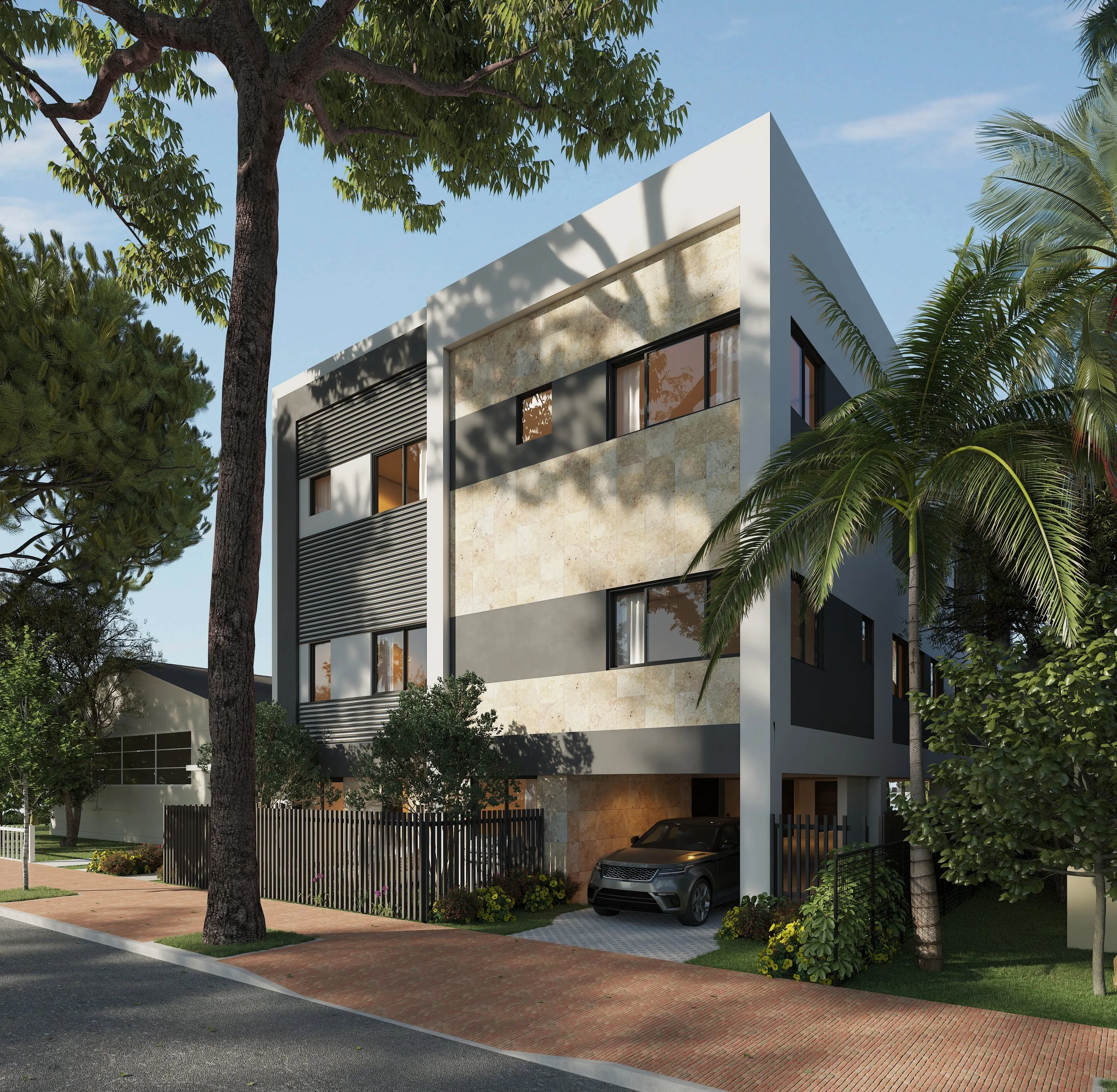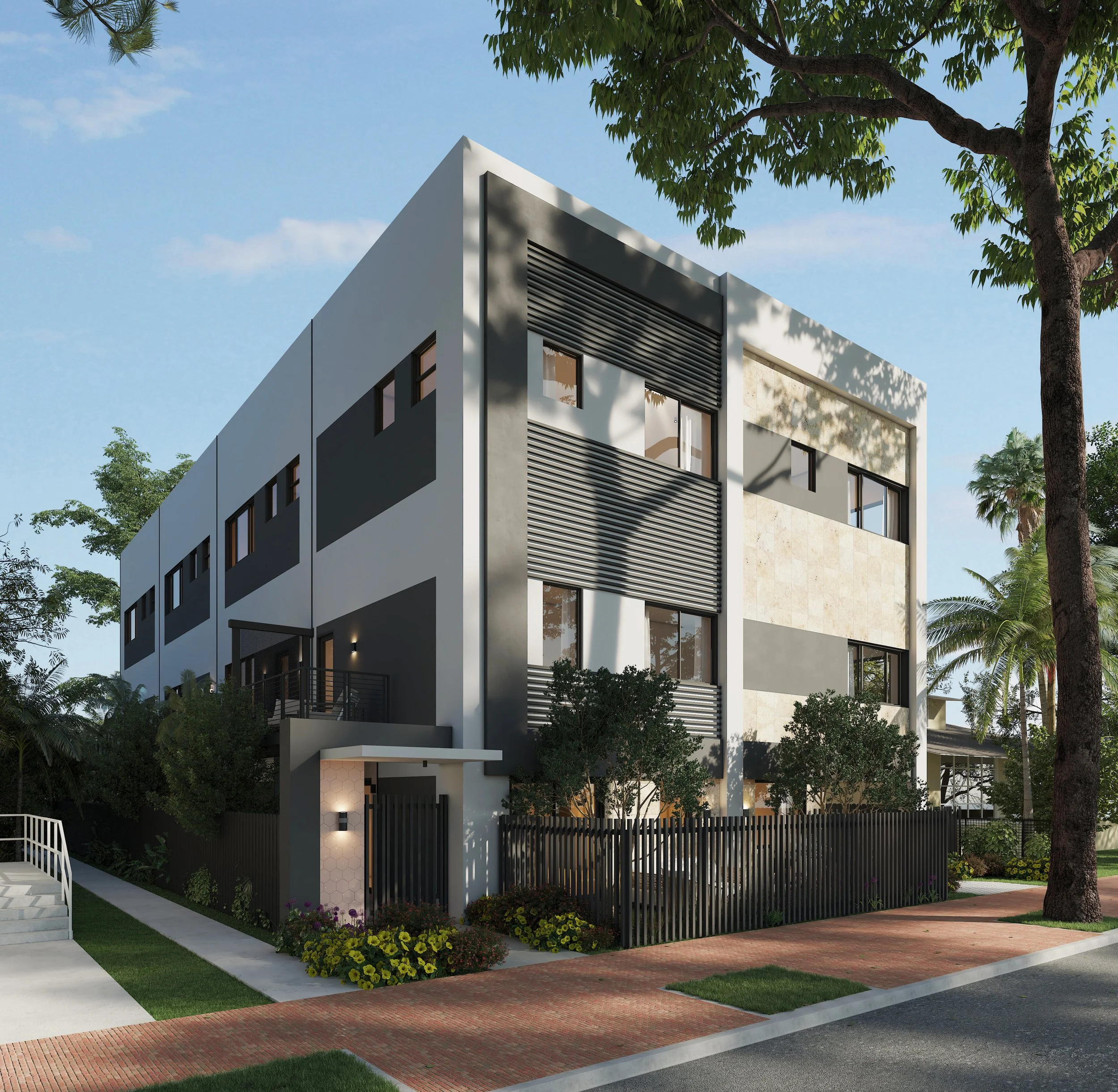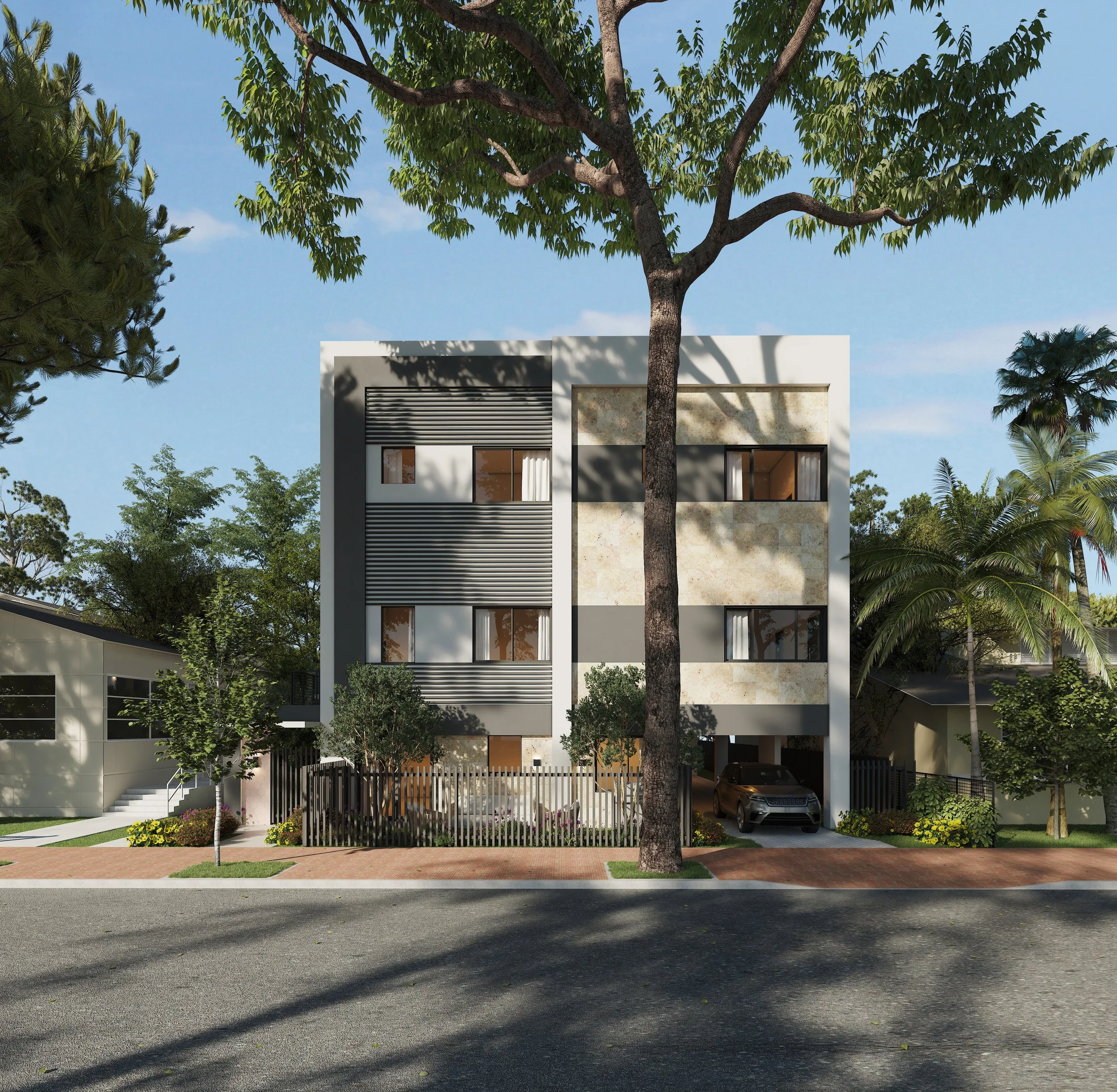 This contemporary multifamily residence near Calle Ocho is defined by a composition of clean rectilinear volumes, deep frames, and layered façade elements that balance solidity and openness. A restrained material palette of light stone, white stucco, charcoal accents, and horizontal metal screening gives the building a refined identity, while recessed openings, shaded glazing, and perimeter landscaping reinforce privacy within the urban residential context.