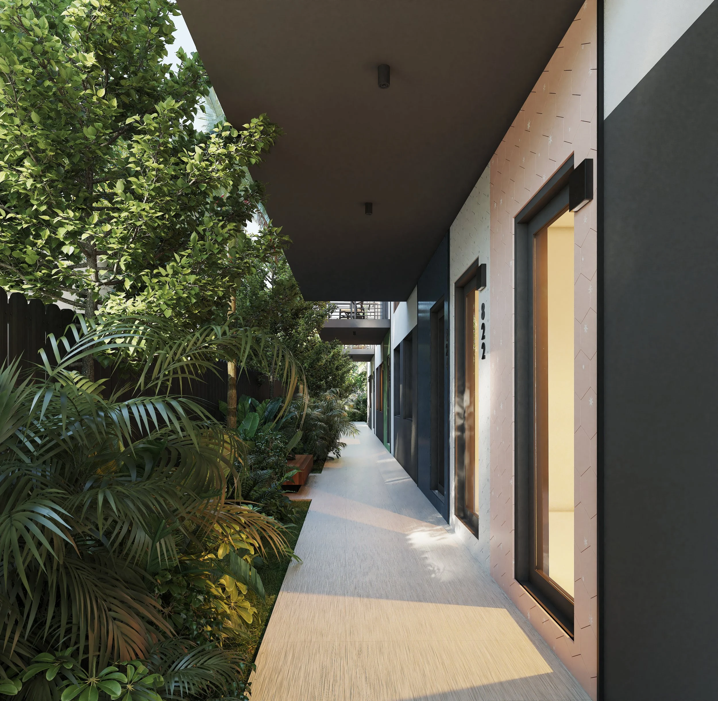 Throughout the project, the architecture is guided by a modern, understated sensibility that prioritizes proportion, material contrast, and livability. Tropical planting, filtered light, and sheltered circulation corridors contribute to a quieter residential atmosphere, creating a building that feels both contemporary and grounded in its Miami setting.